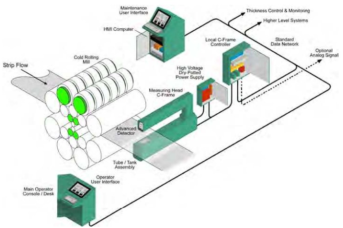 Các yếu tố quan trọng trong cấu trúc hệ thống đo độ dày bằng bức xạ bản chất là sự kết hợp giữa hệ thống kiểm soát, giám sát và các thành phần xử lý tín hiệu với khả năng điều khiển từ xa các thiết bị đo. Ngoài ra còn có các hệ thống dây cáp trường rộng và dải tín hiệu dài được bố trí và lắp đặt đảm bảo hoạt động trong môi trường công nghiệp. Các hệ thống đo lúc mới ra đời hầu hết ở dạng cố định và không thuận tiện cho việc mở rộng khả năng sử dụng (như bổ sung các đầu đo, giao thức vận hành, v.v.). Các thiết kế đó bắt nguồn từ các hệ thống máy tính đơn lẻ, có khả năng xử lý giới hạn các thông số kỹ thuật đo lường. Giao thức vận hành sơ khai với bộ tiếp nhận thông tin sử dụng tín hiệu tương tự có kết nối thông lượng dữ liệu thấp.